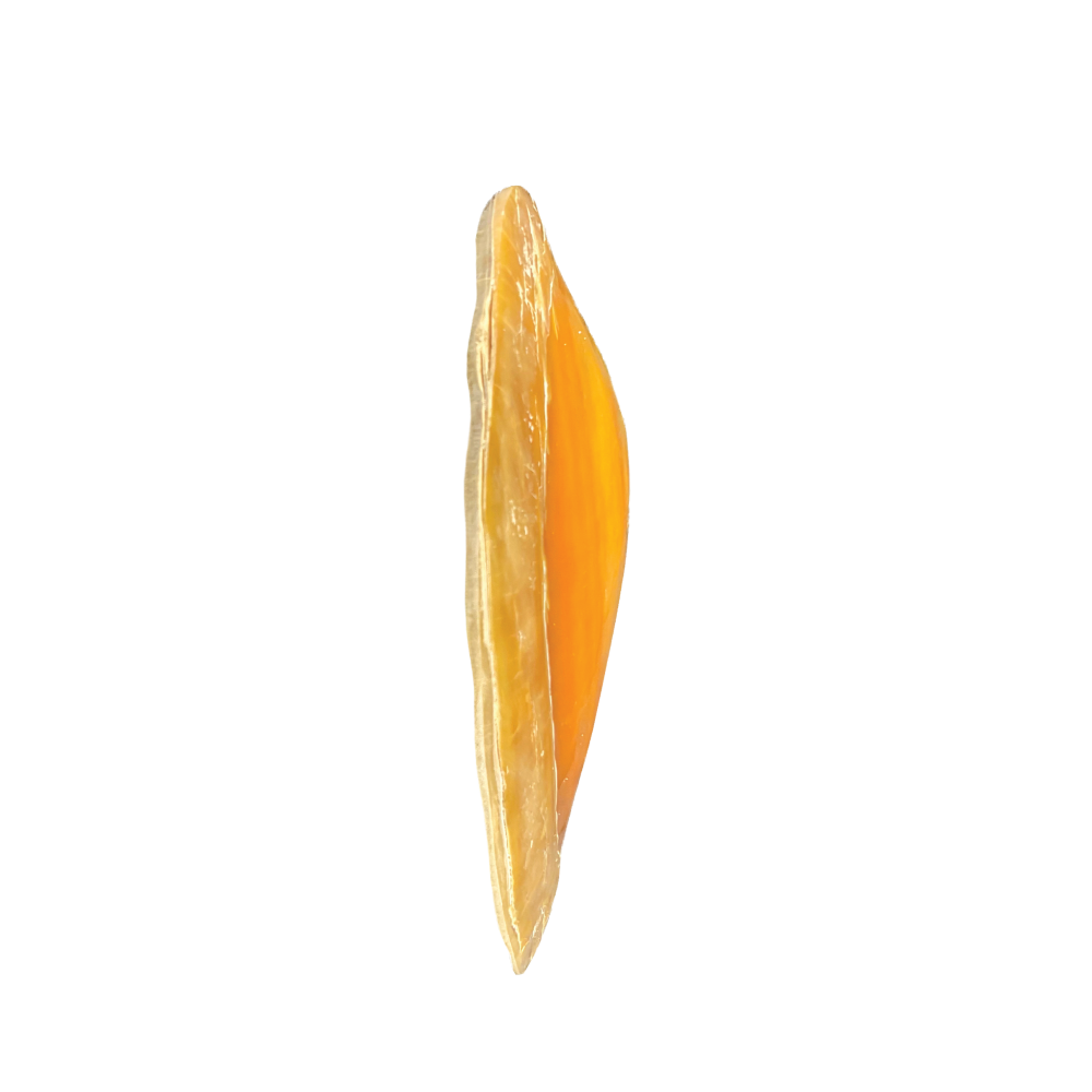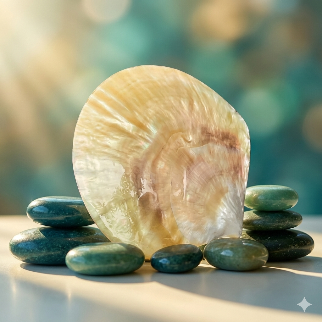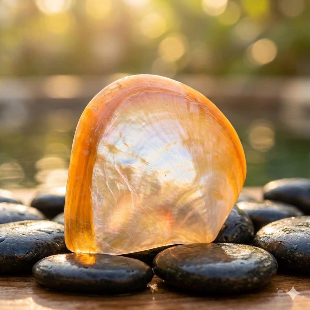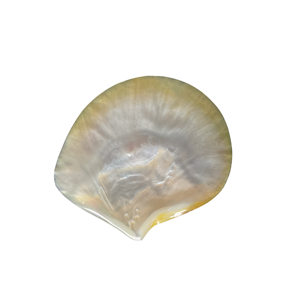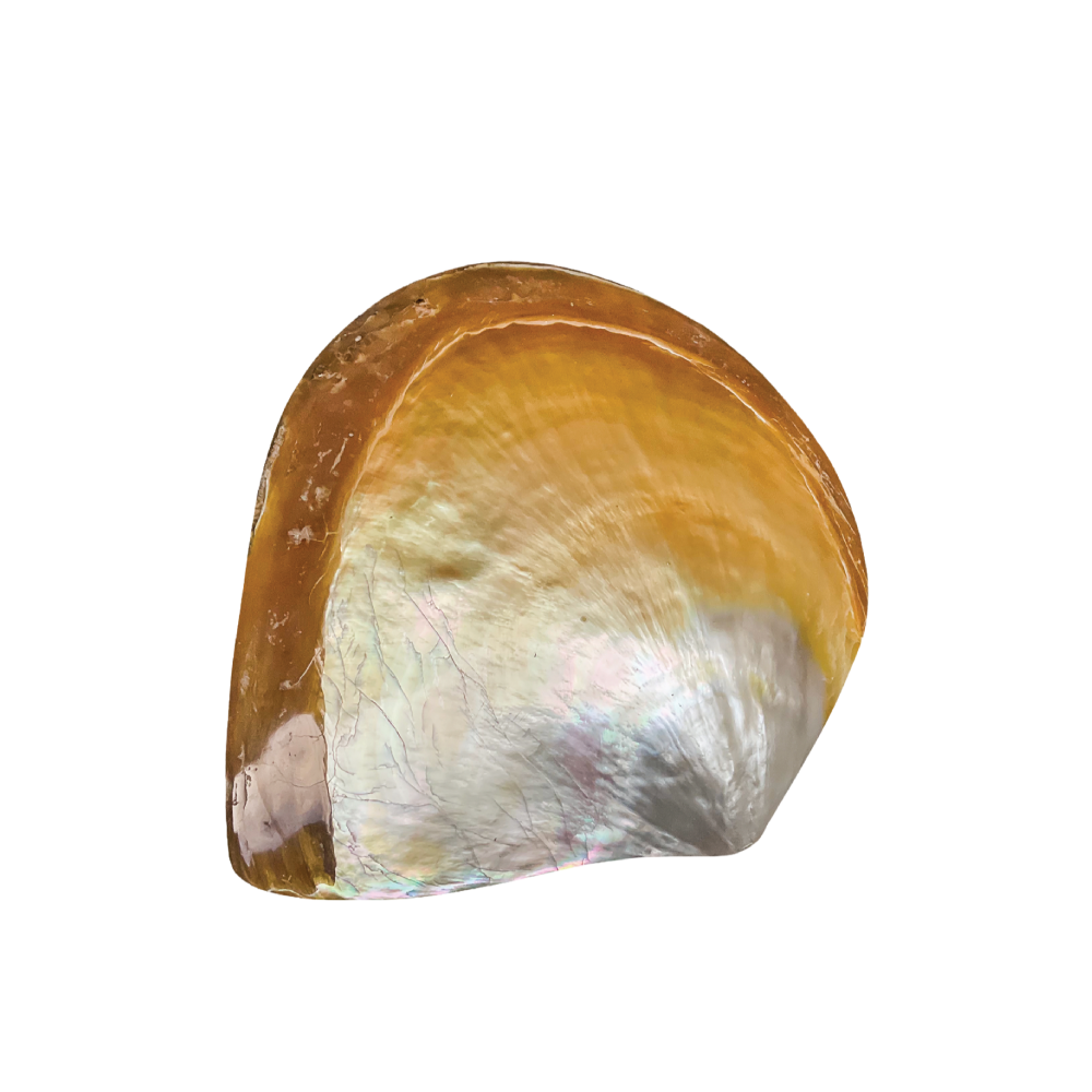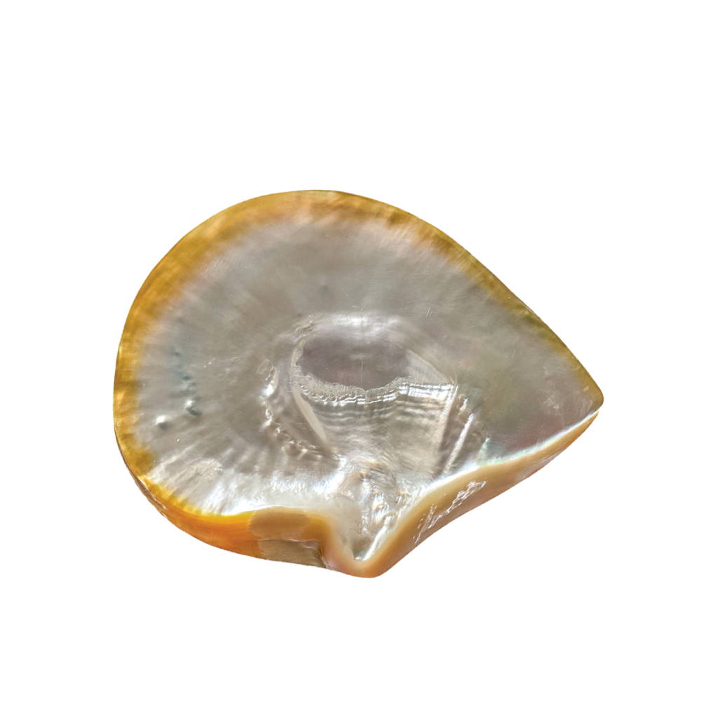 This bivalve shell is polished to reveal its thick, “Mother of Pearl” interior. The “Gold-Lipped” variety features a stunning golden halo around the edges, making it a luxurious tray for jewelry or soap